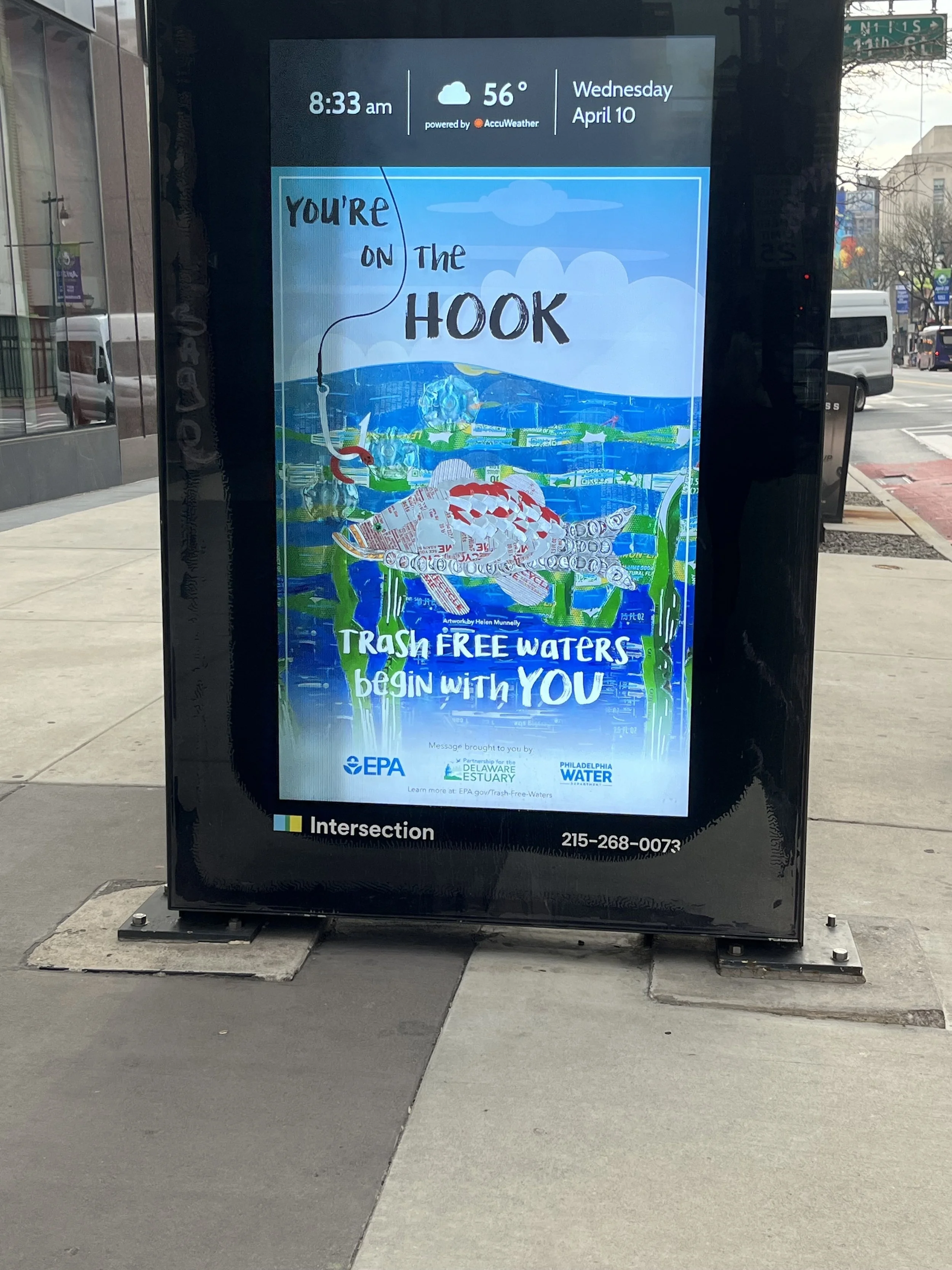 It was the first place winner in the 2023 Trash Free Waters Art Contest organized by the Partnership for the Delaware Estuary. The Fairmount Water Works and Interpretive Center held a group exhibition from January 31 till April 5, 2024 which included this piece along with a selection of other entries in the Trash Free Waters Art Contest. The Partnership for the Delaware Estuary, the EPA and the Philadelphia Water Company turned my artwork into advertisements to help share the message of keeping our waterways trash free. The advertisements were placed on eight Septa digital bus screens and eleven digital screens at Patco stations around Philadelphia for the month of April in 2024.